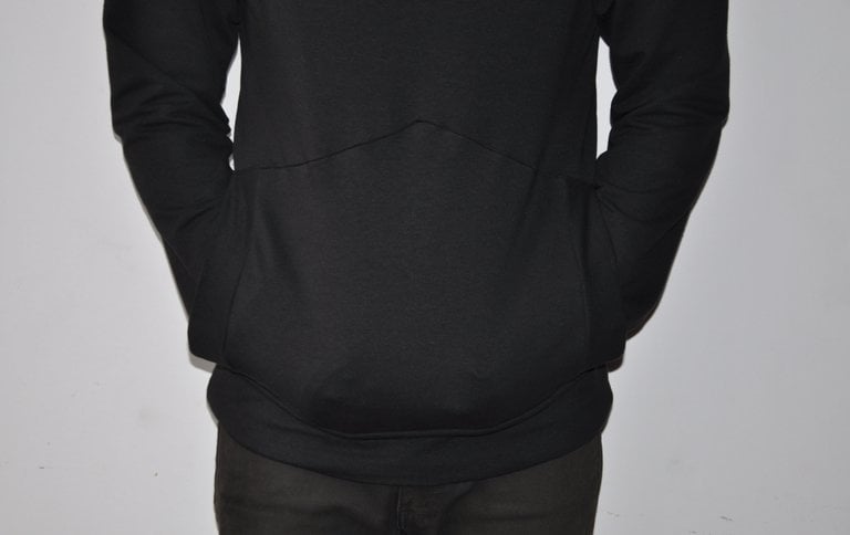 Hoodie is made with organic cotton french terry spandex with four way stretch. Looped in the back with small knit front face. Triangular detail pocket and hood detail in the back. Super big hood will keep you warm and feeling dark.
