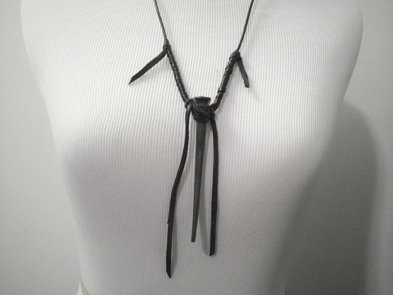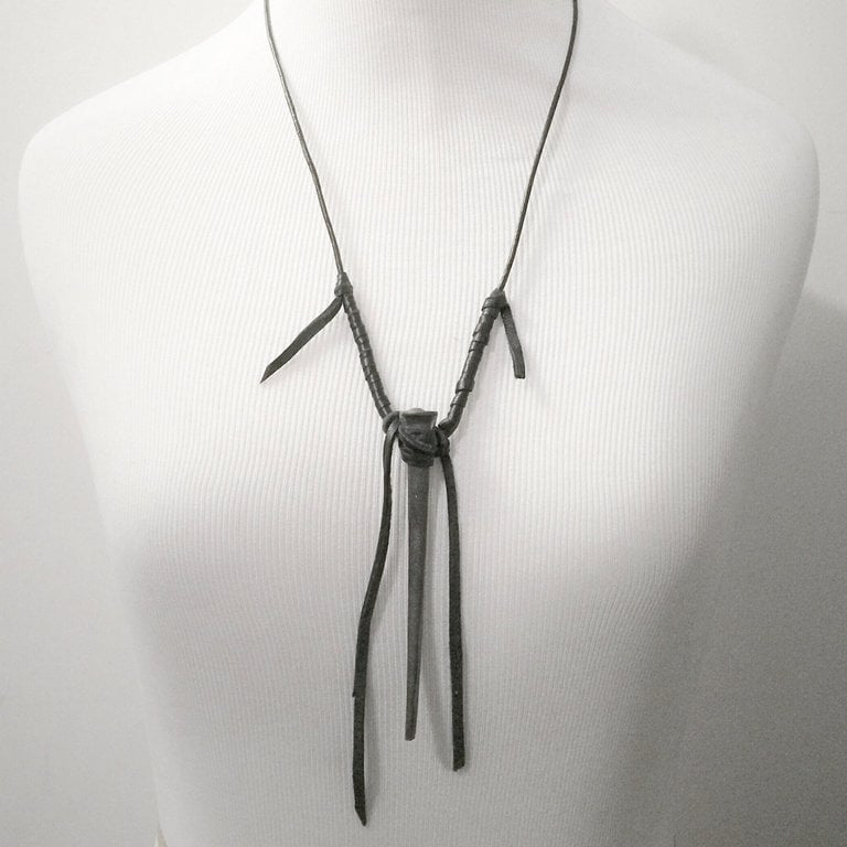 Made with square cut nails, and natural leather cord and detailing. Necklace measures about 26 inches in length with oxide metal loop clasp closure.
